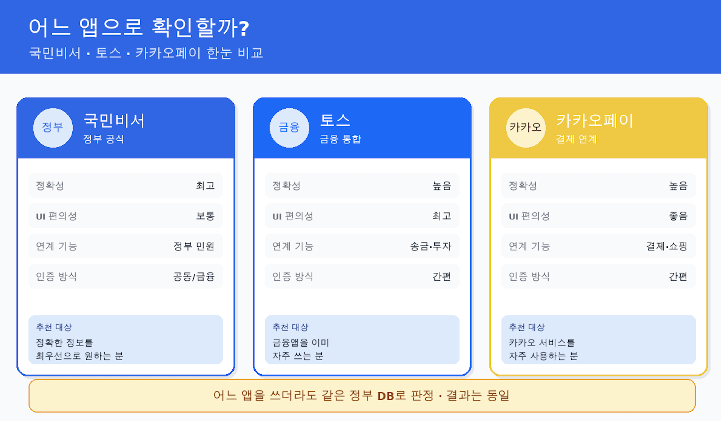현실 조언: 이미 자주 쓰는 앱으로 확인하면 되지만, 정보의 정확성을 최우선으로 생각한다면 국민비서 앱을 추천합니다.