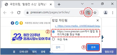 TIP: 모든 사이트에 팝업을 허용하면 보안상 위험할 수 있으므로 신뢰된 사이트만 예외 등록하는 것이 좋습니다.