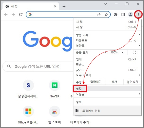 - 크롬 우측 상단의 점 세 개 클릭 → 설정