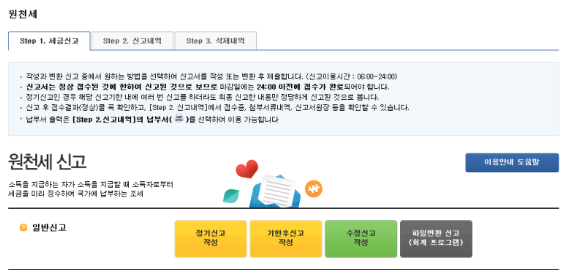 - 홈택스 → [신고/납부] → [세금신고] → [원천세 신고서 작성]