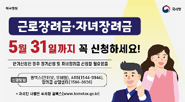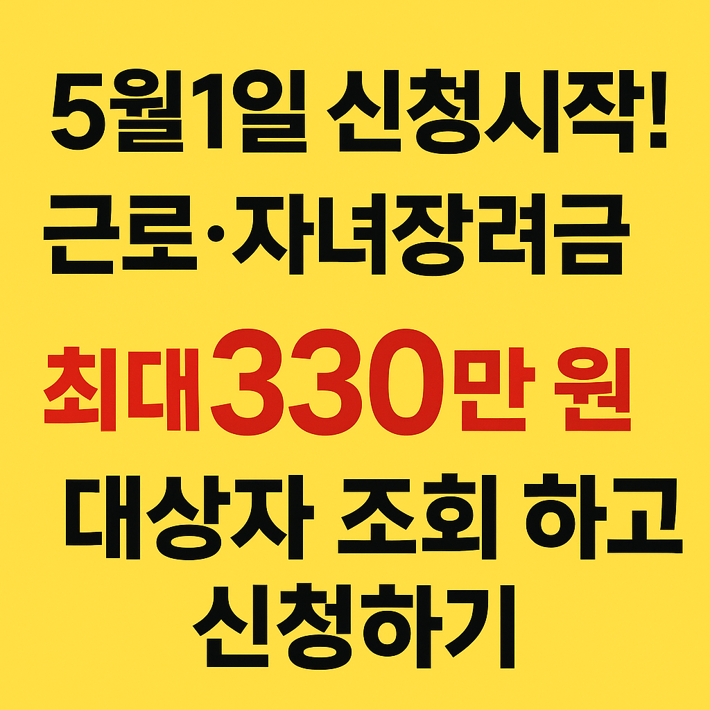5월1일부터 근로·자녀장려금 신청이 시작됩니다. 최대 330만 원까지 지원받을 수 있으니, 대상자 조회 후 빠르게 신청하세요!