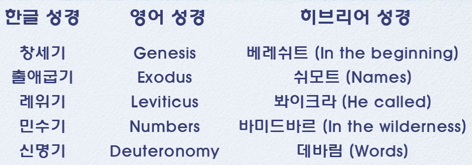 히브리어 성경은 성경의 첫 번째 단어를 따서 책 제목으로 사용했다.
