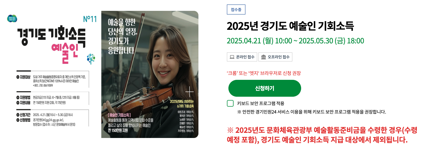 - 예술인 기회소득: 경기도에 거주하며 예술 활동을 지속하고 있는 예술인 등록자 또는 실적 증빙자